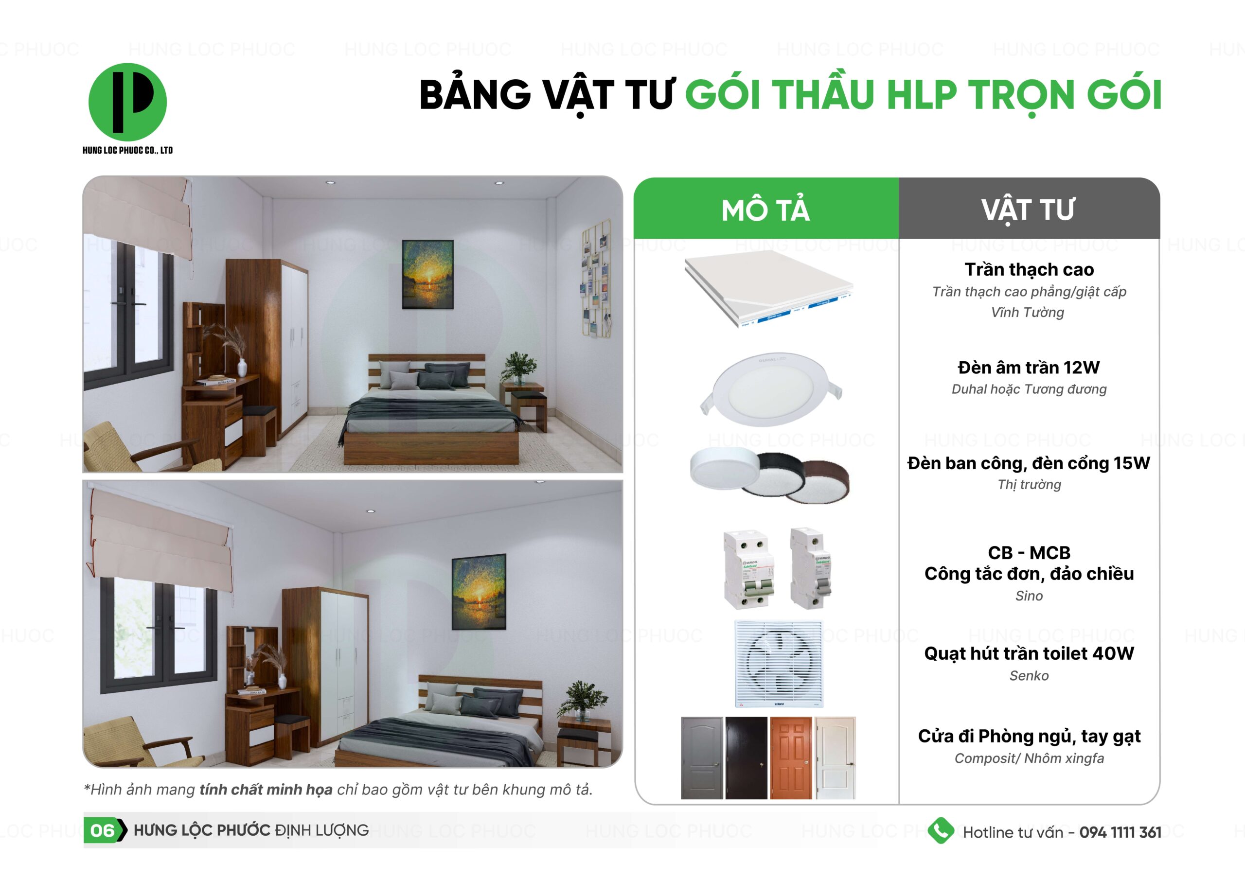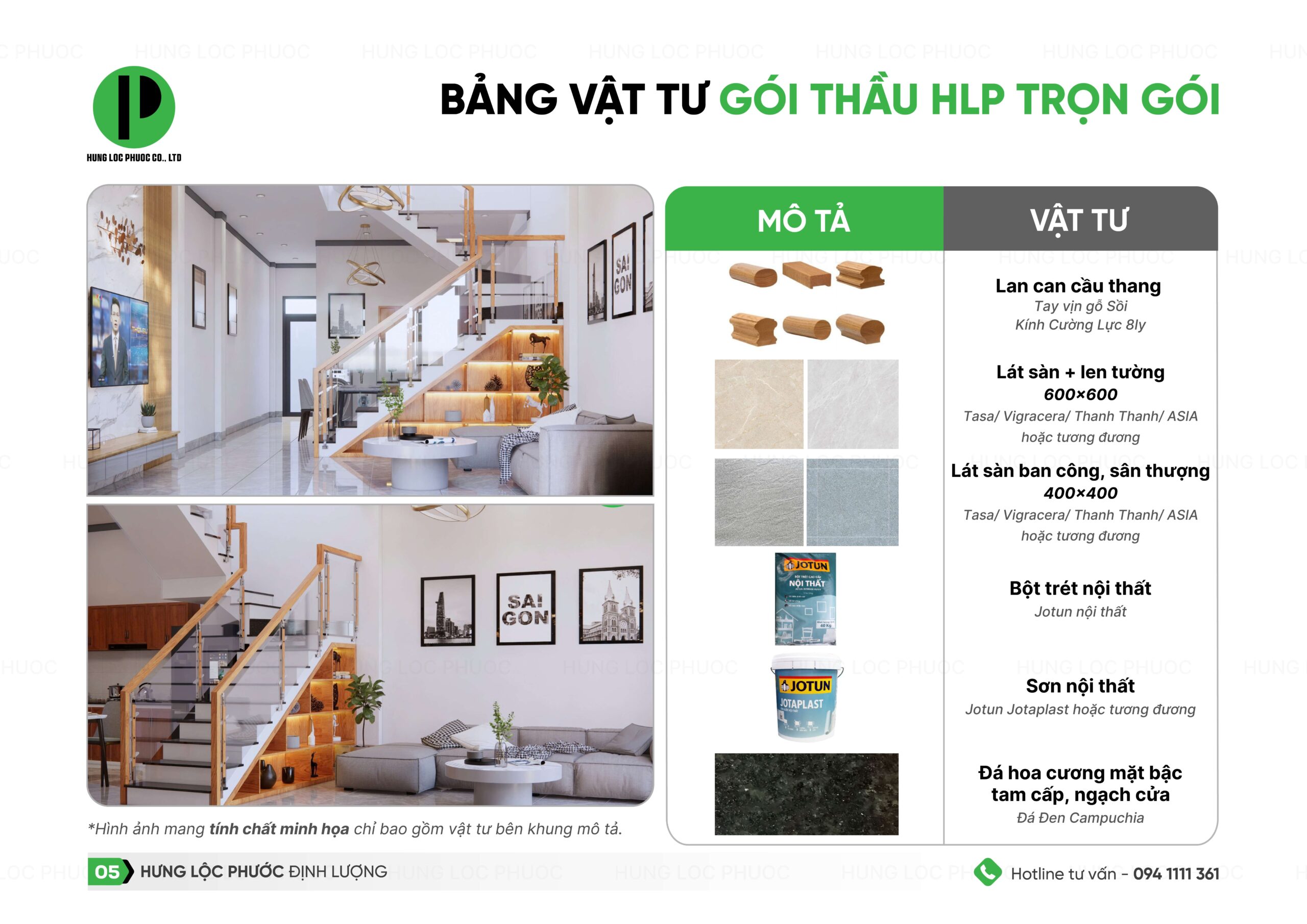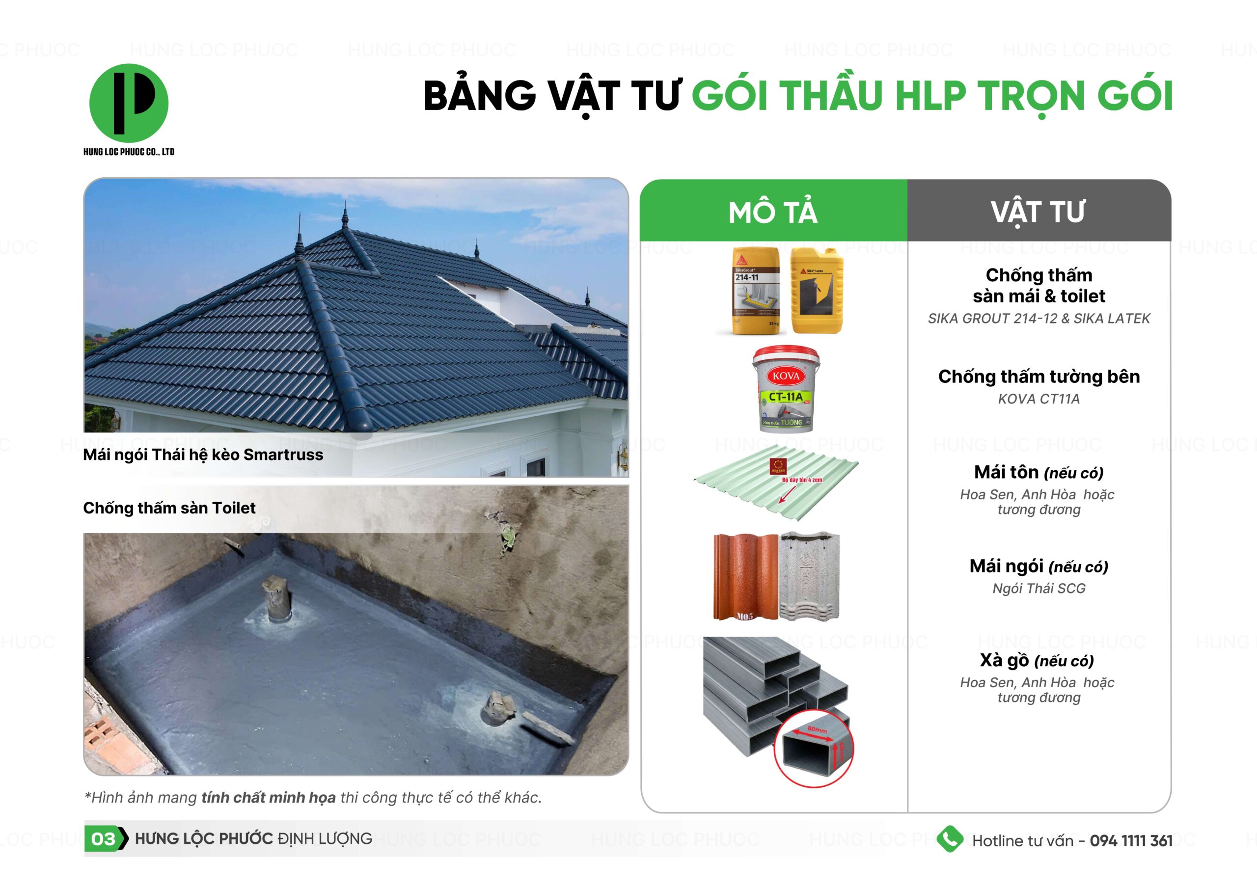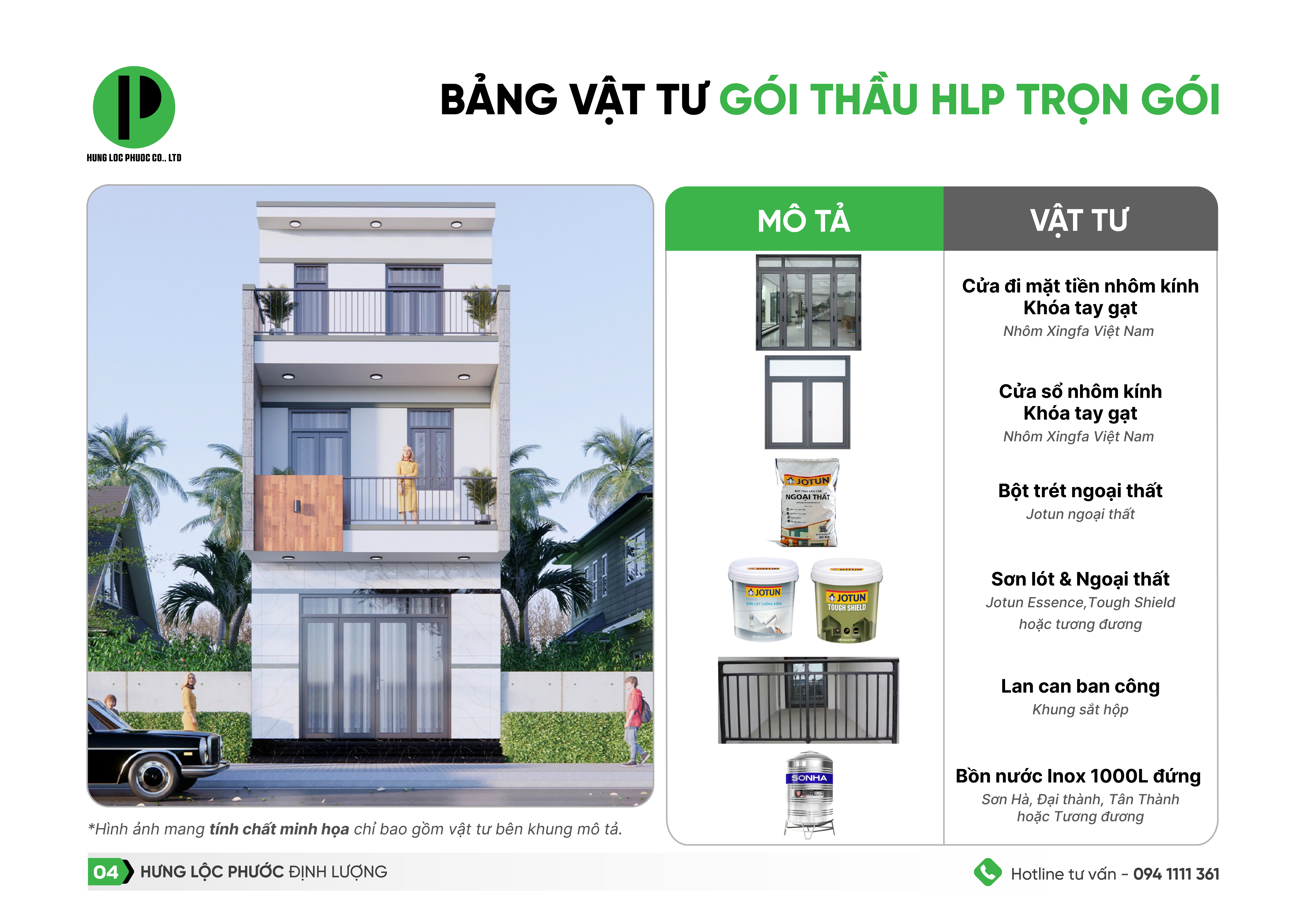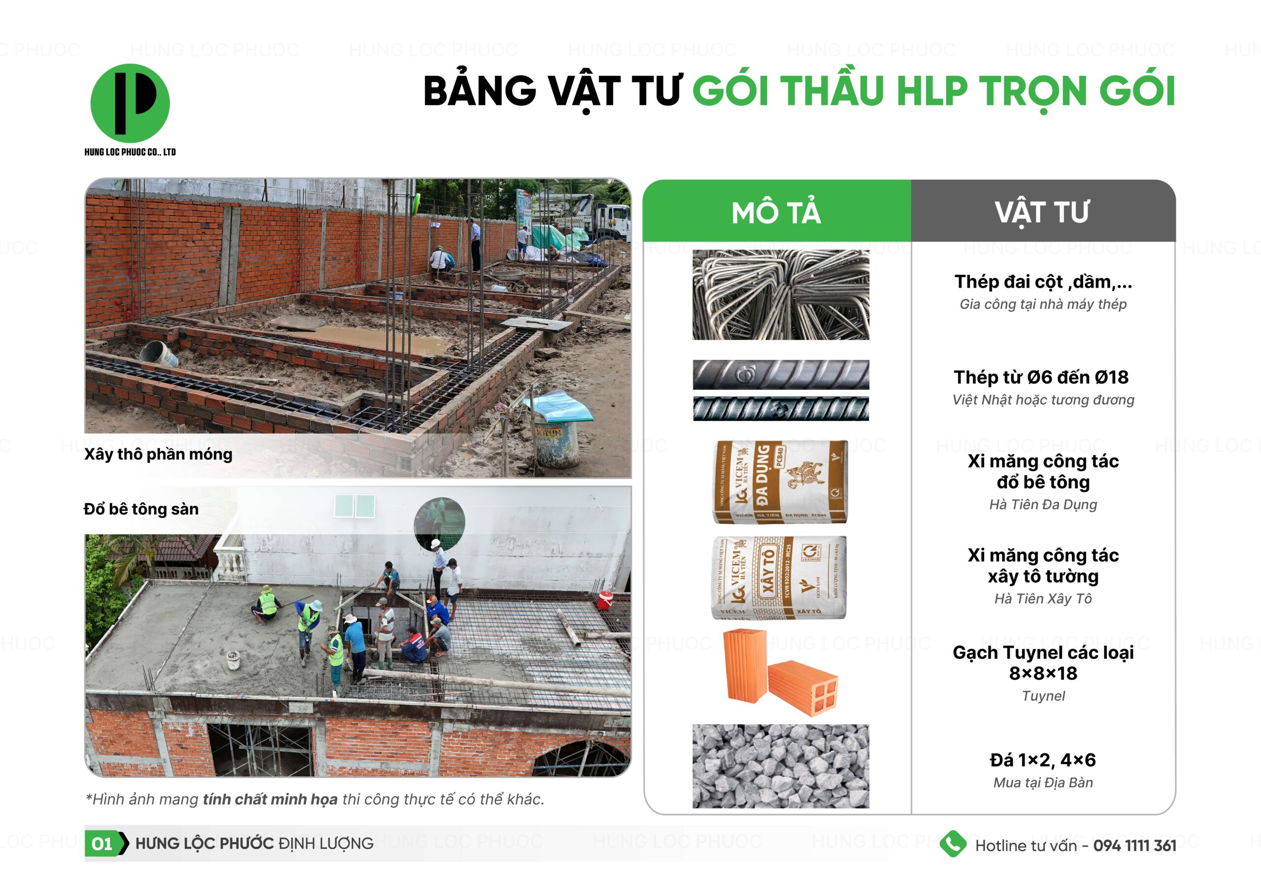 Đối với gói thầu xây nhà trọn gói, sau khi đã chốt mặt bằng, lên thiết kế kiến trúc Hưng Lộc Phước sẽ tính đơn giá và cho ra bảng dự toán. Để bạn dễ hình dung, chúng tôi xin gửi đến bạn bảng thống kê chủng loại vật tư của Gói thầu trọn gói như sau: