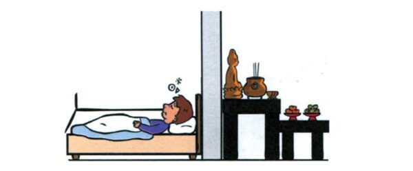 Bàn thờ là nơi linh thiêng, cần sự tĩnh tại tuyệt đối. Đầu giường tựa vào tường phía sau bàn thờ sẽ khiến khí âm và dương xung đột, làm người ngủ cảm thấy bất an, mất ngủ, dễ gặp ác mộng.